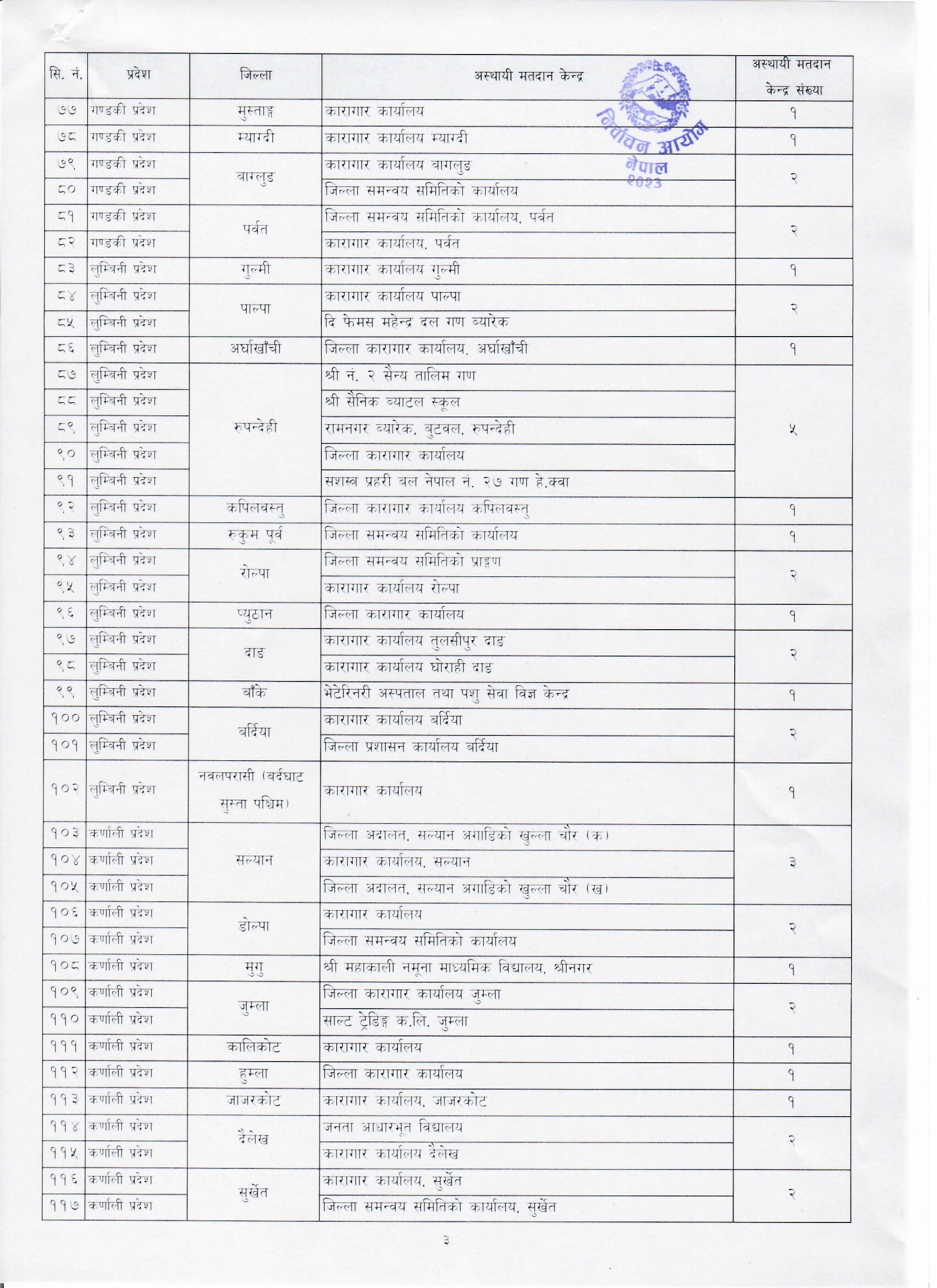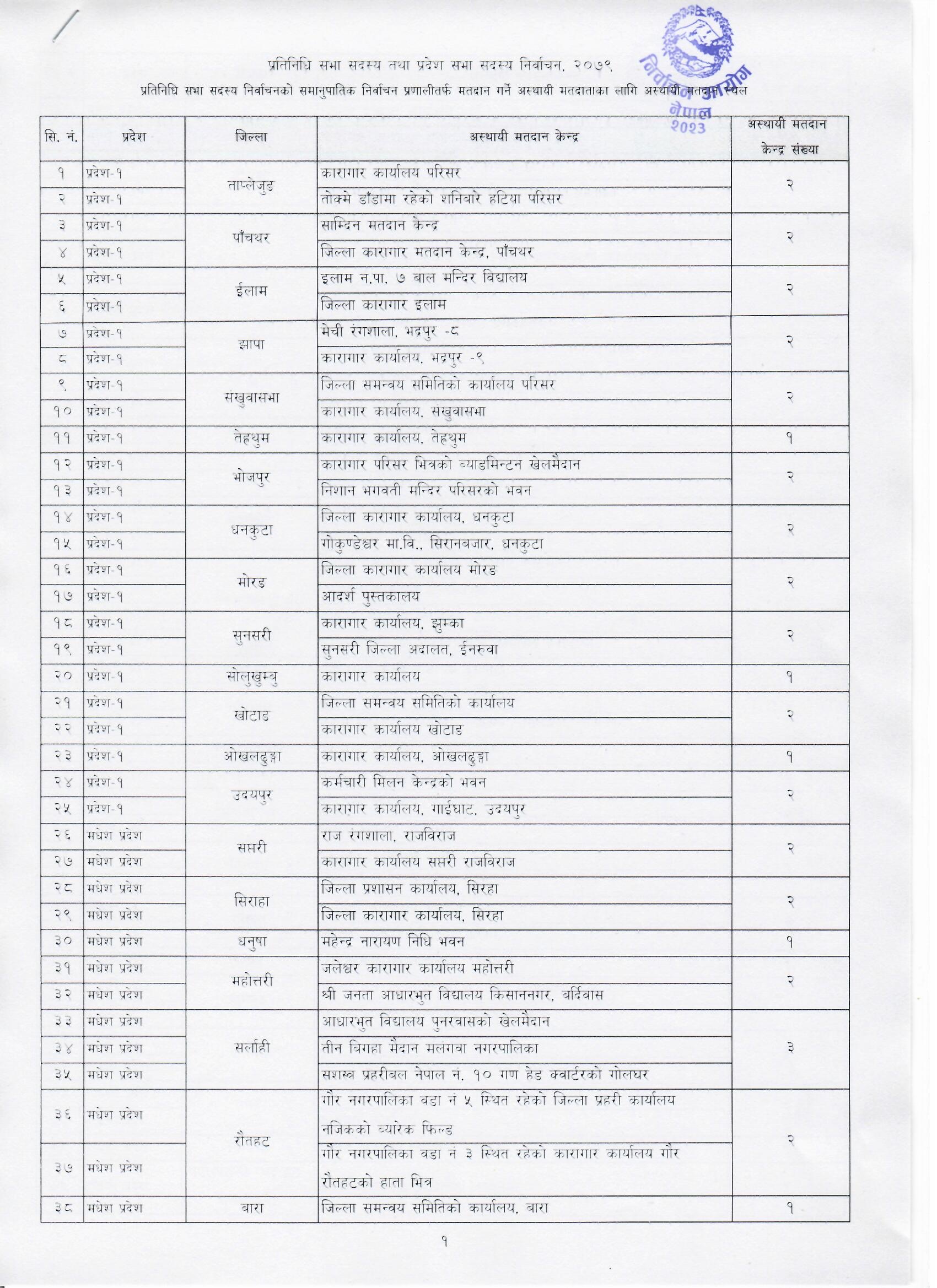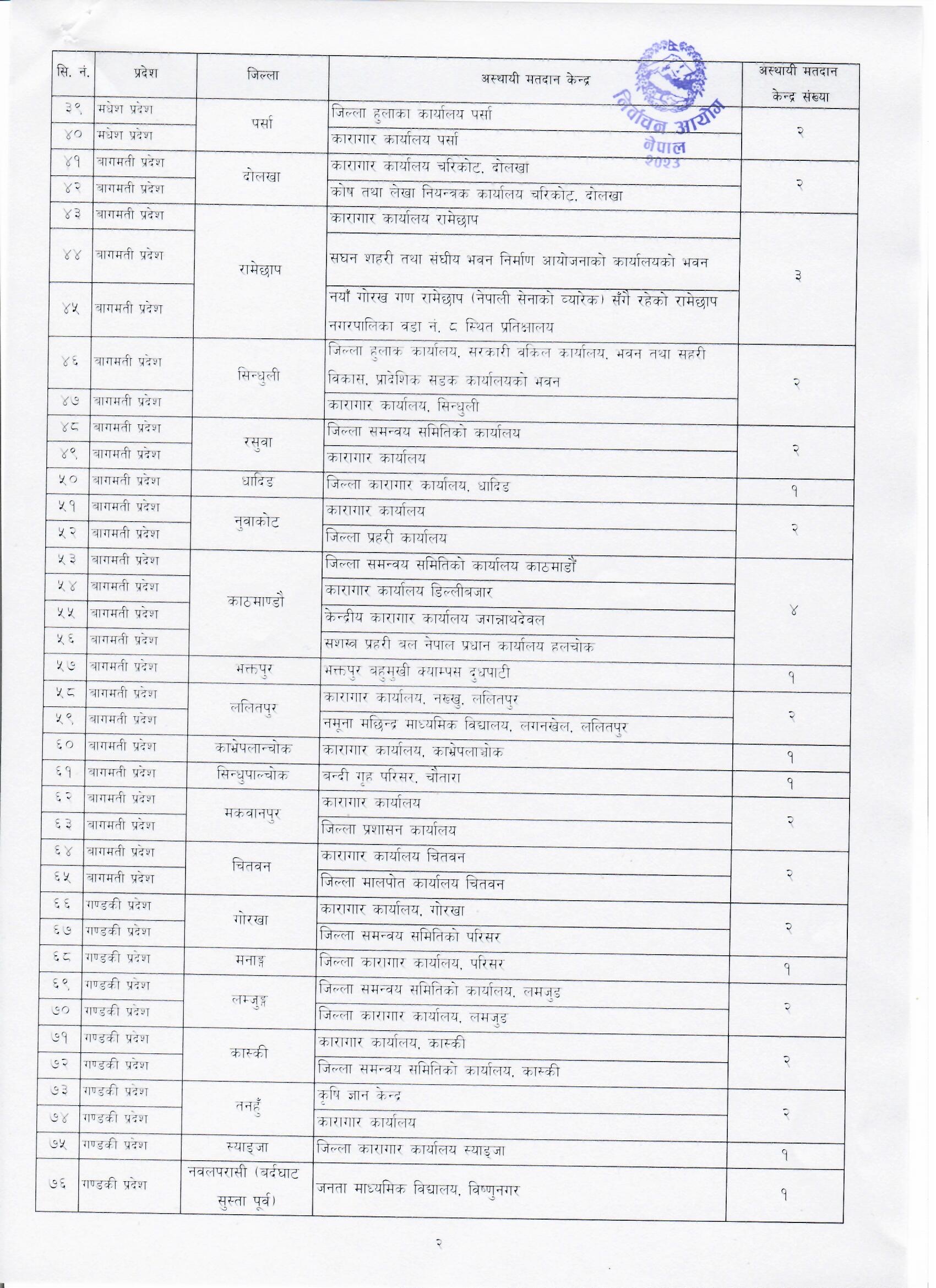 काठमाडौं । निर्वाचन आयोगले समानुपातिक निर्वाचनमा मतदान गर्ने अस्थायी मतदाताका लागि मतदान केन्द्र तोकेको छ । आयोगले बिहीबार विज्ञप्ति जारी गर्दै मंसिर ४ गते हुने प्रतिनिधि तथा प्रदेश सभा निर्वाचनअन्तर्गत समानुपातिकमा मतदान गर्ने अस्थायी मतदाताका लागि मतदान केन्द्र कायम गरेको हो ।