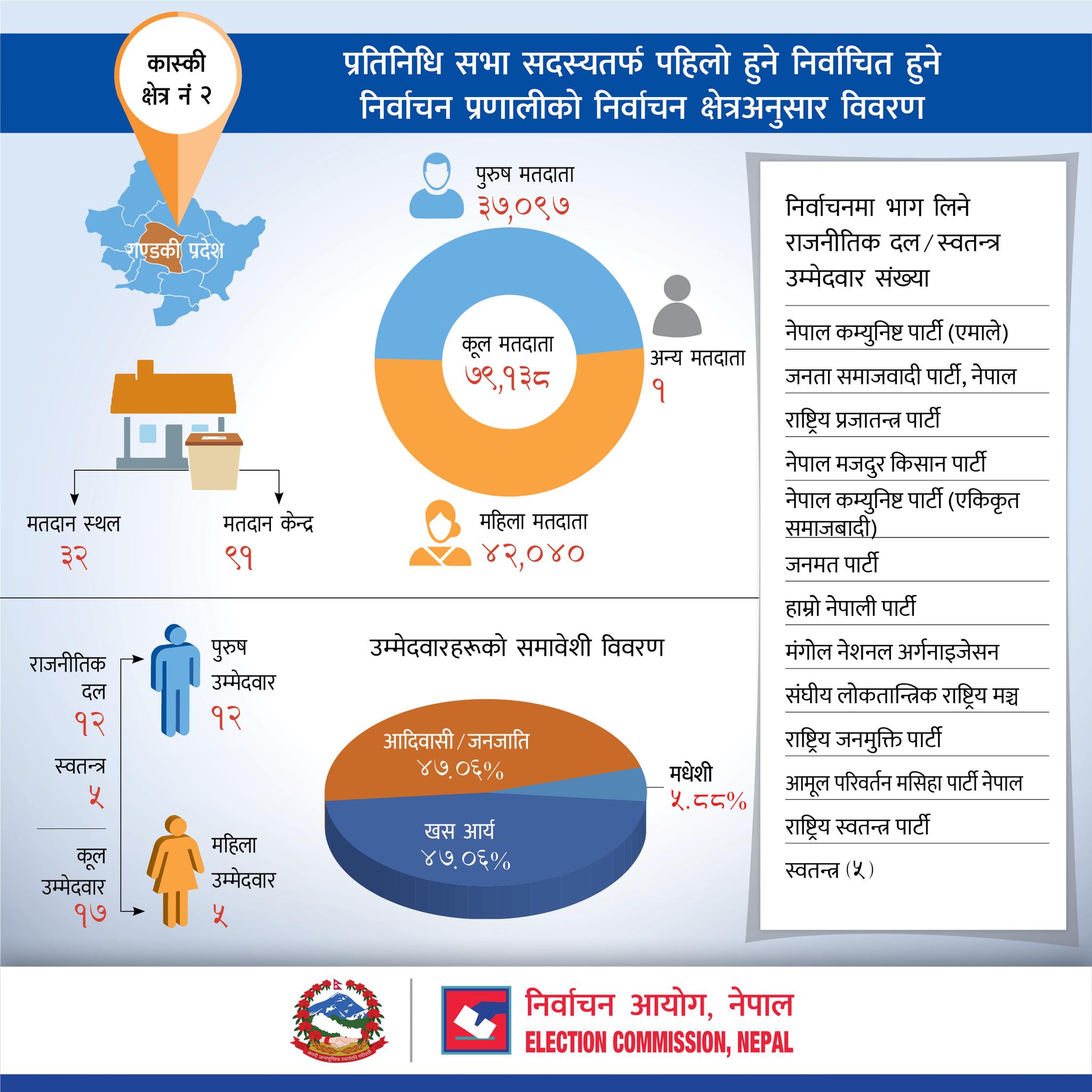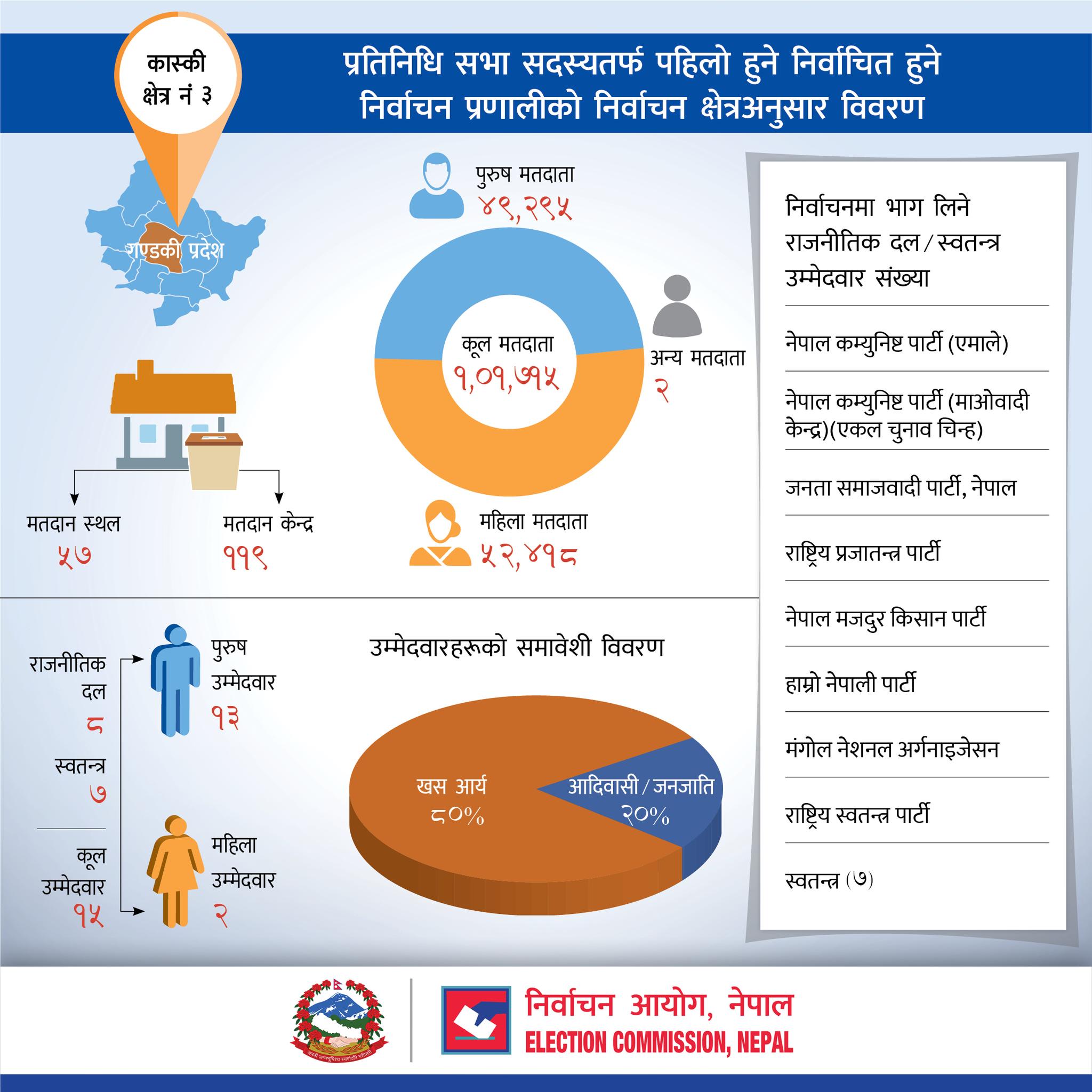 यस्तै, कास्की २ को कुल मतदाता ७९ हजार एक सय ३८ मध्ये ३७ हजार ९७ महिला मतदाता र ४२ हजार ४० पुरुष मतदाता रहेको तथ्यांक छ । कास्की ३ पनि पुरुषको तुलनामा तीन हजारभन्दा बढी मतदाता रहेको तथ्यांक छ । यहाँ कुल एक हजार एक सय ७५ मतदातामध्ये ४९ हजार दुई ९५ पुरुष र ५२ हजार चार सय ५२ पुरुष मतदाता रहेको आयोगको तथ्यांक छ ।
