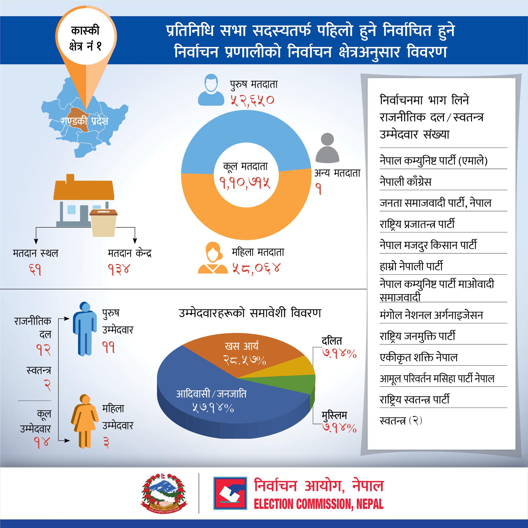 निर्वाचन आयोगका अनुसार कास्की क्षेत्र नम्बर १ मा ५२ हजार ६ सय ५० पुरुष मतदाता छन् भने यहाँ झण्डै ६ हजार बढी मतदाता रहेका छन् । यहाँ ५८ हजार ६४ महिला मतदाता रहेको तथ्यांक छ । निर्वाचन क्षेत्र नम्बर १ मा एक लाख १० हजार सात सय १५ मतदाता रहेका छन् ।