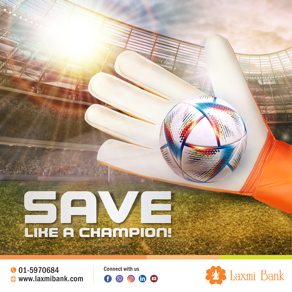 यो विश्वव्यापी लोकप्रियता बोकेको प्रतियोगितालाई उत्सबको रुपमा मनाउने क्रममा लक्ष्मी बैंकले बचतको महत्वलाई उजागर गर्न गोलरक्षकद्वारा फुटबल खेल जित्नलाई गरिने बचाऊ र लगनशीलतापूर्वक व्यक्तिगत तवरमा आफ्नै आर्थिक उपार्जनका लागि गरिने बचतबीच समानता देखाउने उद्देश्यका साथ एक नयाँ योजना “सेभ लाइक अ च्याम्पियन (बचत गरौं, च्याम्पियन बनौं)” सञ्चालन गर्ने भएको छ । यस अभियानले वर्तमानका र भविष्यका दुवै पुस्ताहरुको भविष्य उज्ज्वल बनाउन ‘बचत’ को शक्ति र भावनालाई प्रवद्र्धन एवम् प्रोत्साहन गर्ने लक्ष्य लिएको छ ।