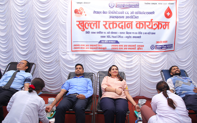 काठमाडौं । नेपालको पहिलो बैंक नेपाल बैंक लिमिटेले आफ्नो ८६ औं वार्षिकोत्सवको अवसरमा बैंकको प्रधान कार्यालय धर्मपथ काठमाडौंमा खुल्ला रक्तदान कार्यक्रमको आयोजना गरेको छ । उक्त कार्यक्रमको उद्घाटन बैंकका नायव प्रमुख कार्यकारी अधिकृत समता पन्तले गरेकी थिइन भने कार्यक्रमको समापन बैैंकका सहायक प्रमुख कार्यकारी अधिकृत प्रकाश कुमार अधिकारीले गरेका थिए ।
