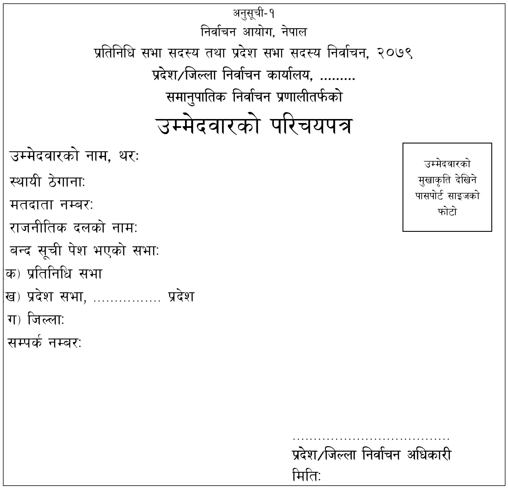 समानुपातिक निर्वाचन प्रणालीतर्फ अन्तिम बन्दसूचीमा नाम रहेका प्रतिनिधि सभा तथा प्रदेश सभातर्फका उम्मेदवारहरूले परिचयपत्र माग गर्न आएमा त्यस्ता उम्मेदवारहरूलाई आयोगको वेबसाइटमा रहेको प्रतिनिधि सभा र प्रदेश सभा समानुपातिक निर्वाचनका लागि प्रकाशित उम्मेदवारको अन्तिम बन्दसूचीमा उल्लेखित मतदाता भएको प्रदेश अन्तर्गतकोे जिल्लाको खण्ड हेरी आफ्नो जिल्ला अन्तर्गतको भए सम्बन्धित प्रदेश र जिल्ला निर्वाचन कार्यालयले आफ्नो कार्यालयबाट जारी हुने परिचयपत्र बमोजिमको विवरण अभिलेख राखी तोकिएको ढाँचामा परिचयपत्र उपलब्ध गराउन आयोगले सबै प्रदेश र जिलला निर्वाचन कार्यालयलाई आयोगले निर्देशन दिएको छ ।