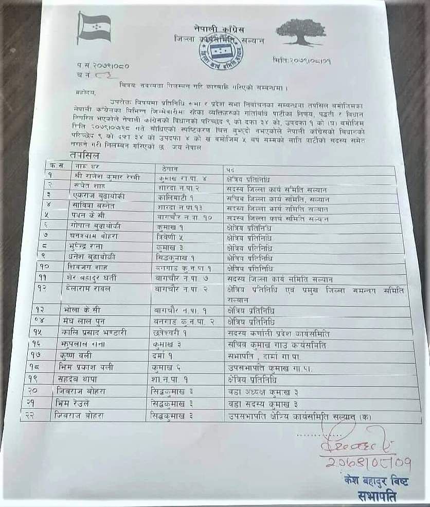 काठमाडाैँ । नेपाली कांग्रेस सल्यानले पार्टीको निर्णयविपरीत लागेको भन्दै जिल्लाका २२ जनालाई कारबाही गरेको छ । कांग्रेसको नीति, पद्धति र विधानविपरीत कार्य गरेको भन्दै ५ वर्षसम्मका लागि साधारण सदस्यसमेत नरहने गरी निलम्बन गरिएको जिल्ला सभापति केशबहादुर विष्टद्वारा जारी विज्ञप्तिमा उल्लेख गरिएको छ ।