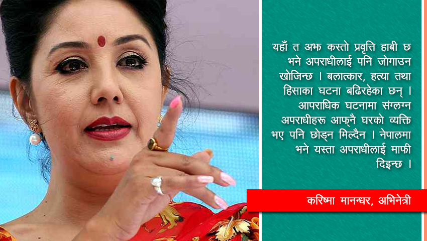 यहाँ त अझ कस्तो प्रवृत्ति हाबी छ भने अपराधीलाई पनि लुकाउन खोजिन्छ । बलात्कार, हत्या र हिंसाका घटना बढिरहेका छन् । आपराधिक घटनामा संग्लग्न अपराधीहरु आफ्नै घरको व्यक्ति भए पनि छोड्न मिल्दैन । नेपालमा भने यस्ता अपराधीलाई माफी दिइन्छ । यसको प्रत्यक्ष प्रभाव, बलात्कारका घटना मौलाउँदै गएका छन् ।