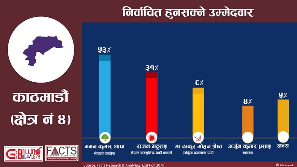 फ्याक्ट नेपालको सर्वेक्षण अनुसार थापाले ठूलो मतान्तरसहित जित हासिल गर्ने देखिएको हो ।