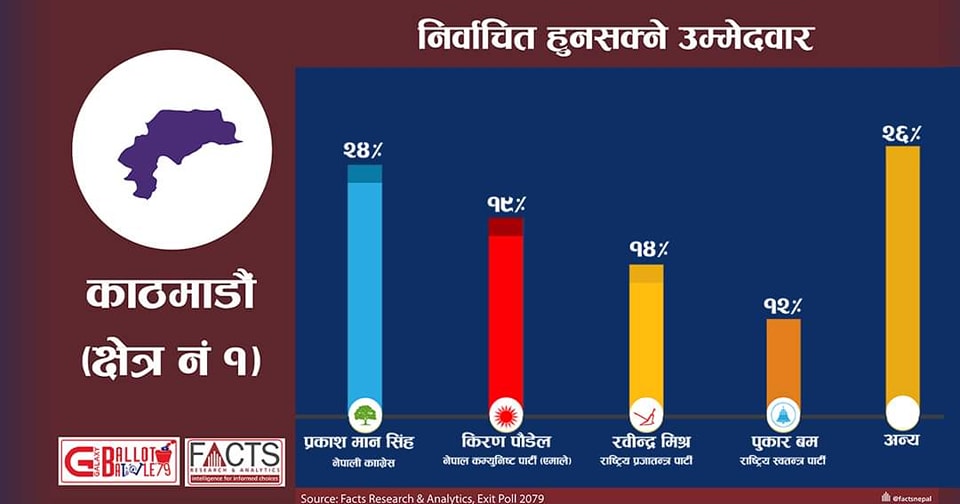फ्याक्ट नेपालको मतदान कार्य सकिसकेपछि गरेको सर्वेक्षण अनुसार नेता सिंंहले फराकिलो मतान्तरसहित जित हासिल गर्ने देखिएको हो ।