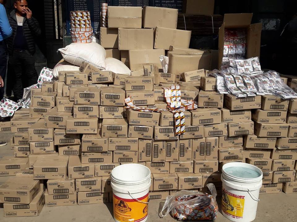 गैरकानूनी रुपमा मसला तथा स्याम्पु उत्पादन गरी बजारमा बिक्री वितरण गरिरहेको सूचनाको आधारमा प्रहरीले खानतलासी गरी ३ थान मेसिन शिलबन्दी गर्नुका साथै ४४ कार्टुन बिएमसी मिट मसला, ११ बोरा मसलाको कच्चा पदार्थ धुलो बिएमसी मसला प्याक गर्ने प्लास्टिक प्रिन्टेड रोल ११ वण्डल, प्लास्टिक रोल ५ वण्डल, तयारी मसला ठूला कार्टुन खाली २५० थान, तयारी स्याम्पू ३७० बक्स, स्याम्पू कच्चा पदार्थ २ बाल्टिन, खाली ड्रम २० थान मेशिल ठूला ३ थान लगायतका सामान बरामद गरेको छ ।