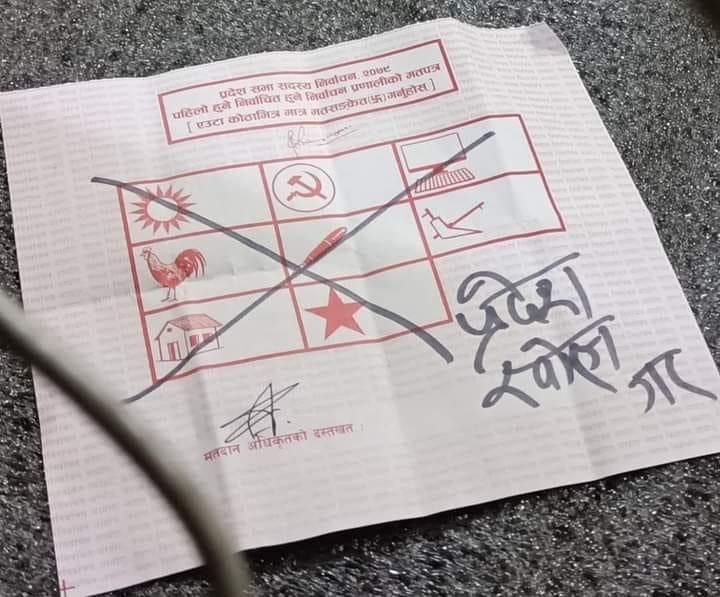 प्रदेशसभा तर्फको प्रत्यक्ष निर्वाचनको मतपत्रमा यस्तो सन्देशसहितको मतपत्र फेला परेको निर्वाचन अधिकृतको कार्यालयले जनाएको छ ।