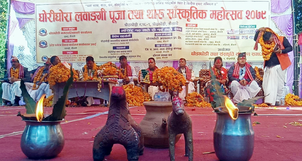 कैलाली । कैलालीको घोडाघोडीमा घोरीघोरा लवाङ्गी पूजा तथा थारू सांस्कृतिक महोत्सव २०७९ सुरु भएको छ । घोडाघोडी तथा संस्कृति संरक्षण समाजको आयोजनामा ‘थारु भाषा, कला, धर्म, संस्कृति के गरी सम्मान, घोरीघोरा धार्मिक पर्यटकीय क्षेत्र हे चिनाइ ना हमार अभियान’ भन्ने मूल नाराका साथ घोडाघोडी मन्दिर परिसरमा महोत्सव सुरु भएको हो ।