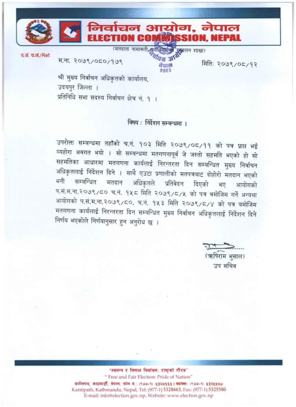 काठमाडौं। उदयपुर क्षेत्र नम्बर-१ को स्थगित मतगणना सुचालु गर्न निर्वाचन आयोगले निर्देशन दिएको छ । आयोगले अहिले पठाएको पत्रमा मतगणनापूर्व भएको सहमतिका आधारमा गणना कार्यलाई निरन्तरता दिन मुख्य निर्वाचन अधिकृतलाई निर्देशन दिएको छ ।