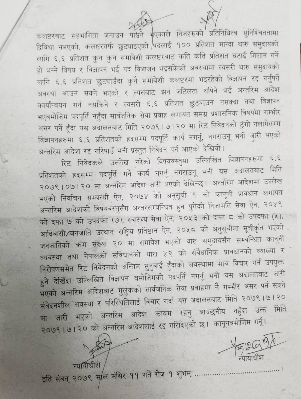 सर्वोच्च अदालतका न्यायाधीशहरू प्रकाशमानसिंह राउत र कुमार चुडालको संयुक्त इजलासले मंसिर ११ गते उक्त अन्तरिम आदेश खारेज गरेको हो । अन्तरिम आदेशको लिखित प्रति भने मंगलबार सार्वजनिक भएको हो ।