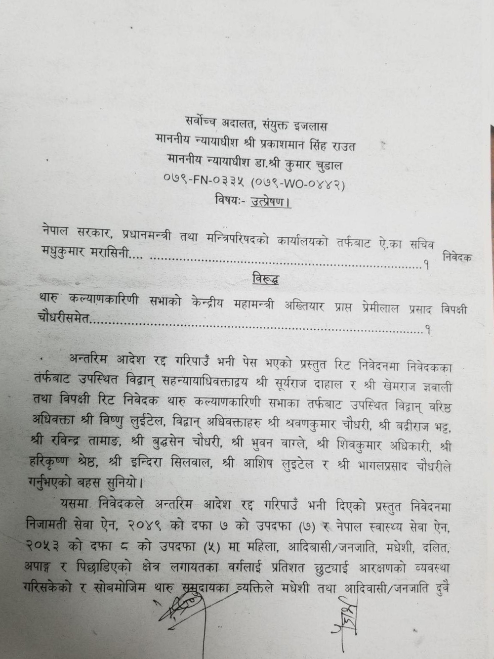 सर्वोच्चद्वारा थारु समुदायको आरक्षणको पक्षमा जारी अन्तरिम आदेश खारेज