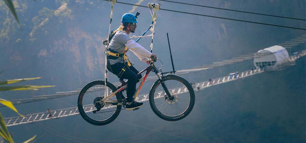 पर्वत । विश्व साइकलयात्री अजित बरालले पर्वतमा सञ्चालित जिपलाइनमा पहिलोपटक साइकल कुदाएका छन् । कुश्मास्थित जिपलाइनमा उनले मङ्गलबार साइकल कुदाएका हुन् ।