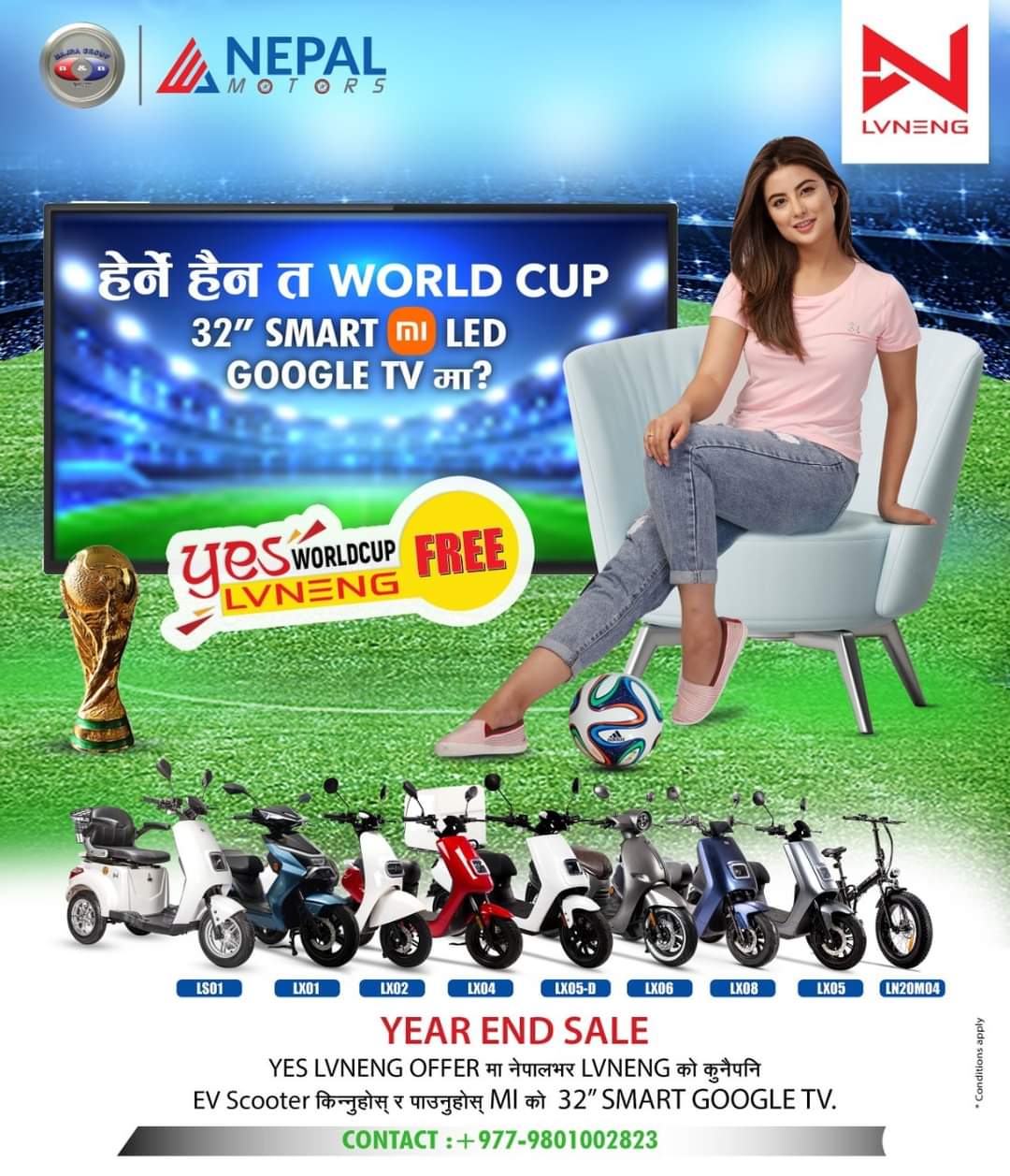 काठमाडाैं । हाल विश्व कप फुटबल चलिरहेको र यसका लागि कुनै पनि स्कुटर किन्ने ग्राहकले MI 32″ आकर्षक टीभी उपहारको रुपमा निशुल्क व्यवस्था गरिएको ईभी नेपाल मोटर्सले जनाएको छ ।