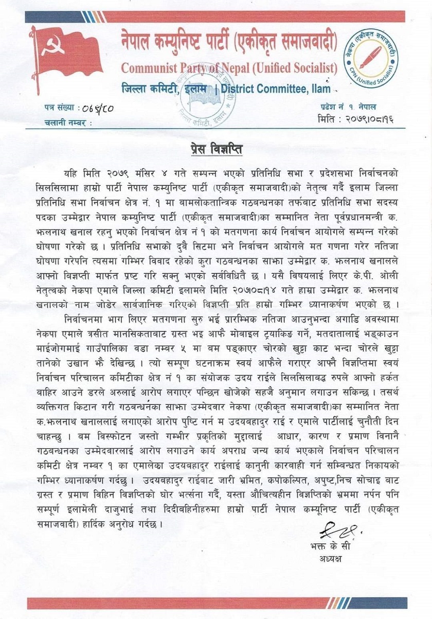‘व्यक्तिगत किटानी गरी गठबन्धनका साझा उम्मेदवार नेकपा (एकीकृत समाजवादी) का सम्मानित नेता क.झलनाथ खनाललाई लगाइएको आरोप पुष्टि गर्न म उदयबहादुर राई र एमाले पार्टीलाई चुनौती दिन चाहान्छु’ विज्ञप्तिमा उल्लेख गरिएको छ ।