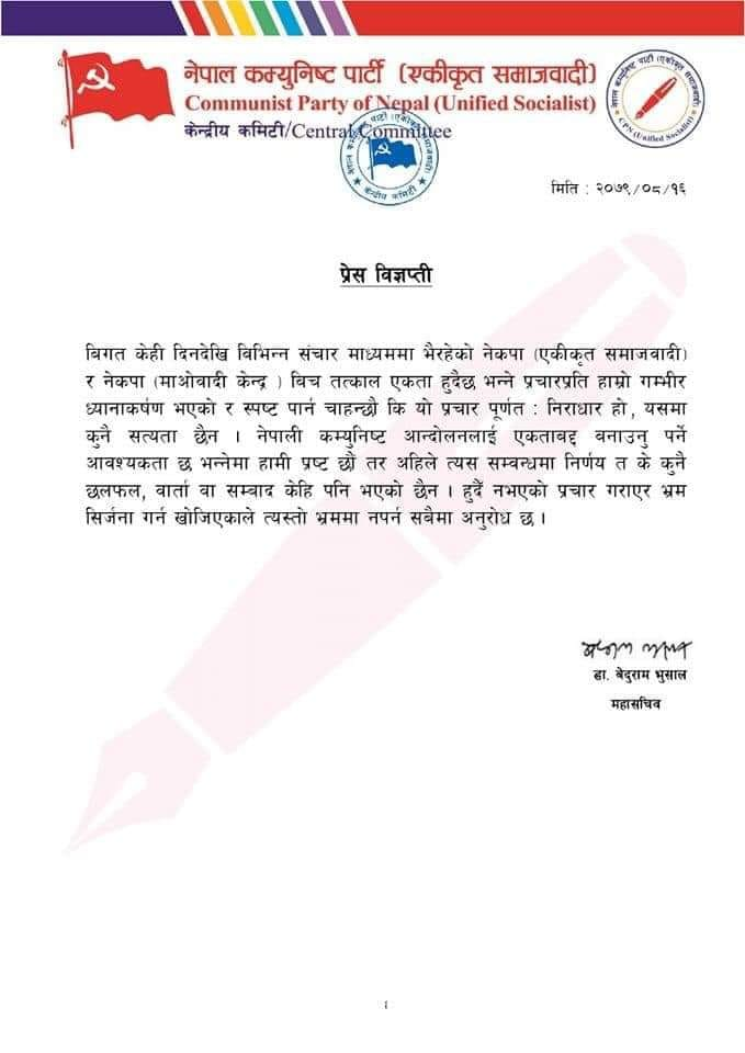 विज्ञप्तिमा केही दिनदेखि विभिन्न सञ्चारमाध्यममा नेकपा एस र माओवादी केन्द्रबीच तत्काल एकता हुँदैछ भन्ने प्रचार भएको उल्लेख गर्दै यो प्रचार पूर्णतः निराधार भएको उल्लेख छ ।