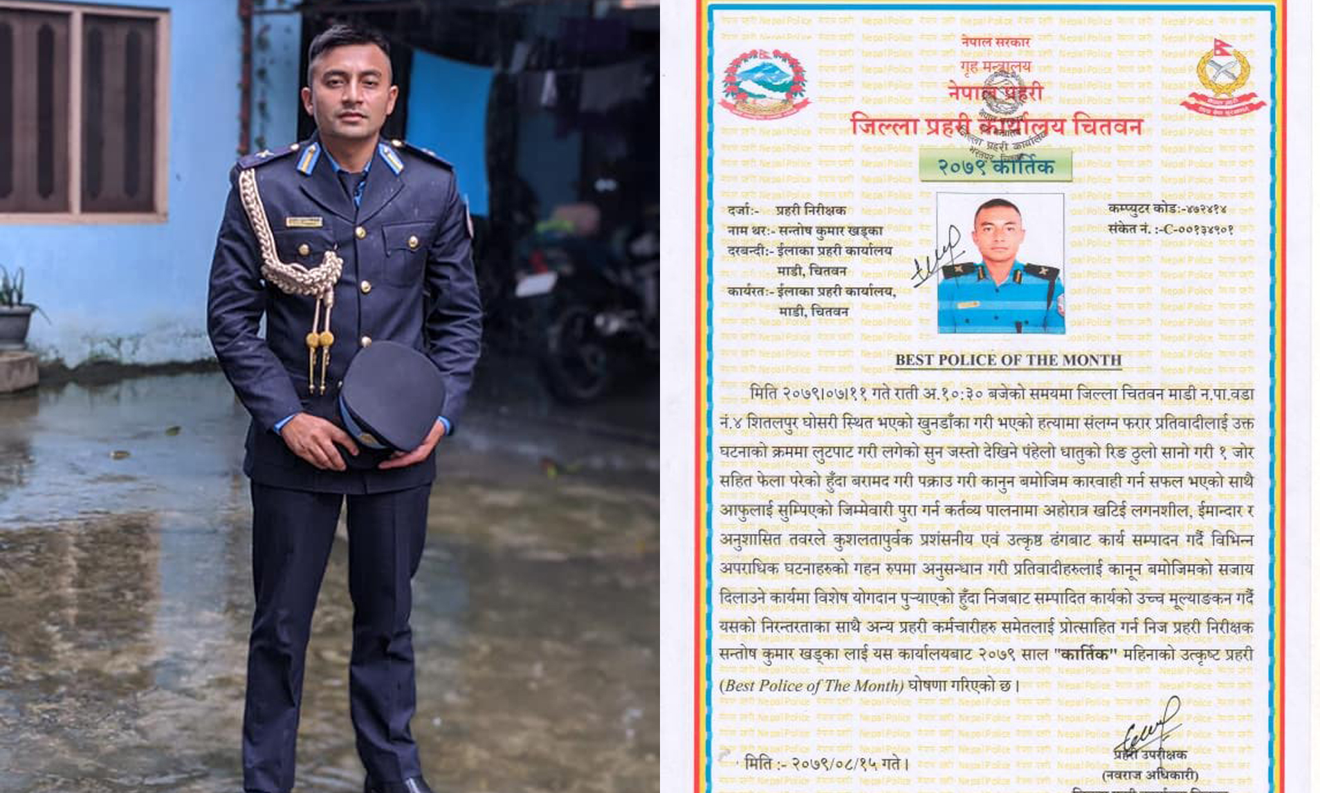चितवन । ईलाका प्रहरी कार्यलय माडि, चितवनमा कार्यरत प्रहरी निरीक्षक सन्तोष कुमार खड्का कार्तिक महिनाको उत्कृष्ट प्रहरी (Best Police of the Month)बाट घोषित भएका छन् ।