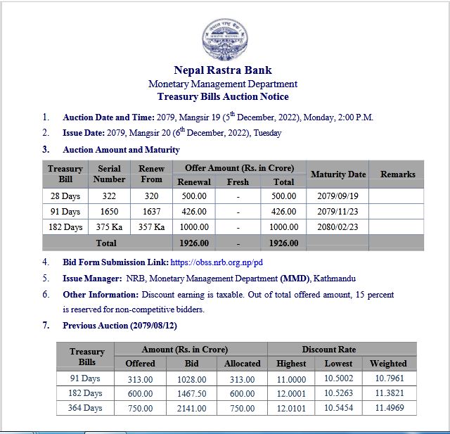 मंसिर २० गते जारी मिति तोकिएको ट्रेजरी बिल खरिदको लागि वाणिज्य बैंक, विकास बैंक र फाइनान्स कम्पनीहरुले भाग लिन सक्ने छन् । राष्ट्र बैंकका अनुसार बिक्री गरिने कुुल ट्रेजरी मध्येमा २८ दिने अवधिको पाँच अर्ब, ९१ दिने अवधिको चार अर्ब २६ करोड र एक सय ८२ दिने अवधिको १० अर्ब रुपैयाँ बराबरको रहेको छ ।