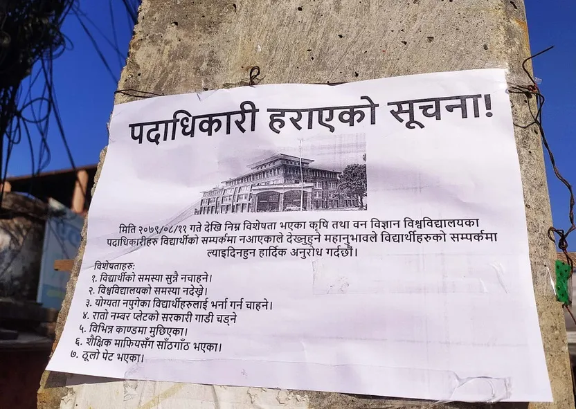 विभिन्न माग राख्दै एक सातादेखि आन्दोलन गर्दै आएको संयुक्त विद्यार्थी संगठनले विश्वविद्यालयका पदाधिकारी हराएको भन्दै सूचना टाँस गरेको हो ।