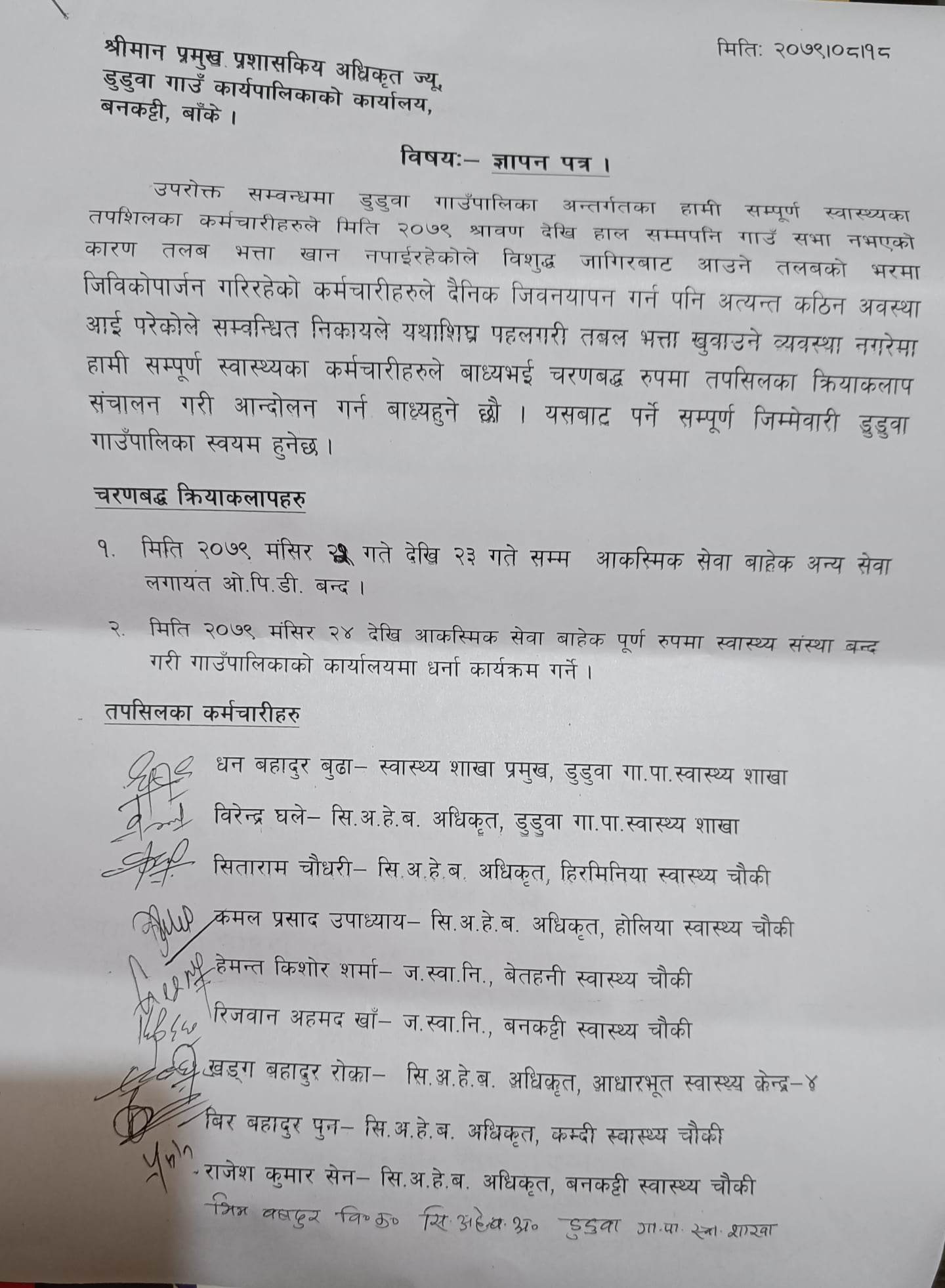 तलब भत्ताको व्यवस्था नभएपछि उनीहरुले यही मसिंर २२ गतेदेखि २३ गतेसम्म आकस्मिक सेवा बाहेक अन्य सेवा ओपिडी बन्द गर्ने र मसिंर २४ गतेदेखि आकस्मिक सेवा बाहेक पूर्ण रुपमा स्वास्थ्य संस्था बन्द गरि गाउँपालिका कार्यालयमा धर्ना दिने कार्यक्रम ज्ञापनपत्रमा उल्लेख गरेका छन् । करिब ८४ जना स्वास्थ्यकर्मीहरुद्वारा हस्ताक्षरित उक्त ज्ञापनपत्र बुझ्दै सदस्य सचिव पौडेलले गाउँसभा सञ्चालन नभएर सेवा सुविधा ठप्प भएको स्वीकारदै सम्पुर्ण कर्मचारीहरुको काम गरेवापतको सुविधा पाउने अधिकार रहेको भन्दै यो विषयमा जनप्रतिनिधीहरुले गम्भीरका साथ लिनुपर्नेमा जोड दिँदै यो विषयलाई गाउँसभा अध्यक्षमार्फत पेश गर्ने बताए ।