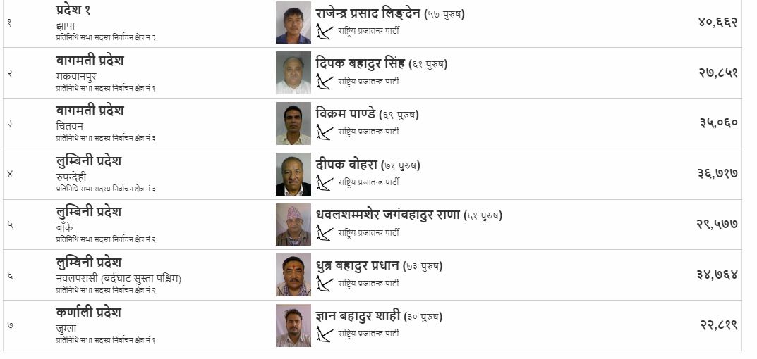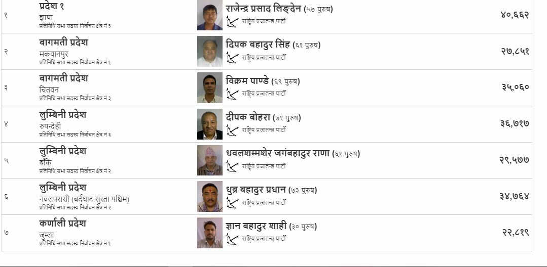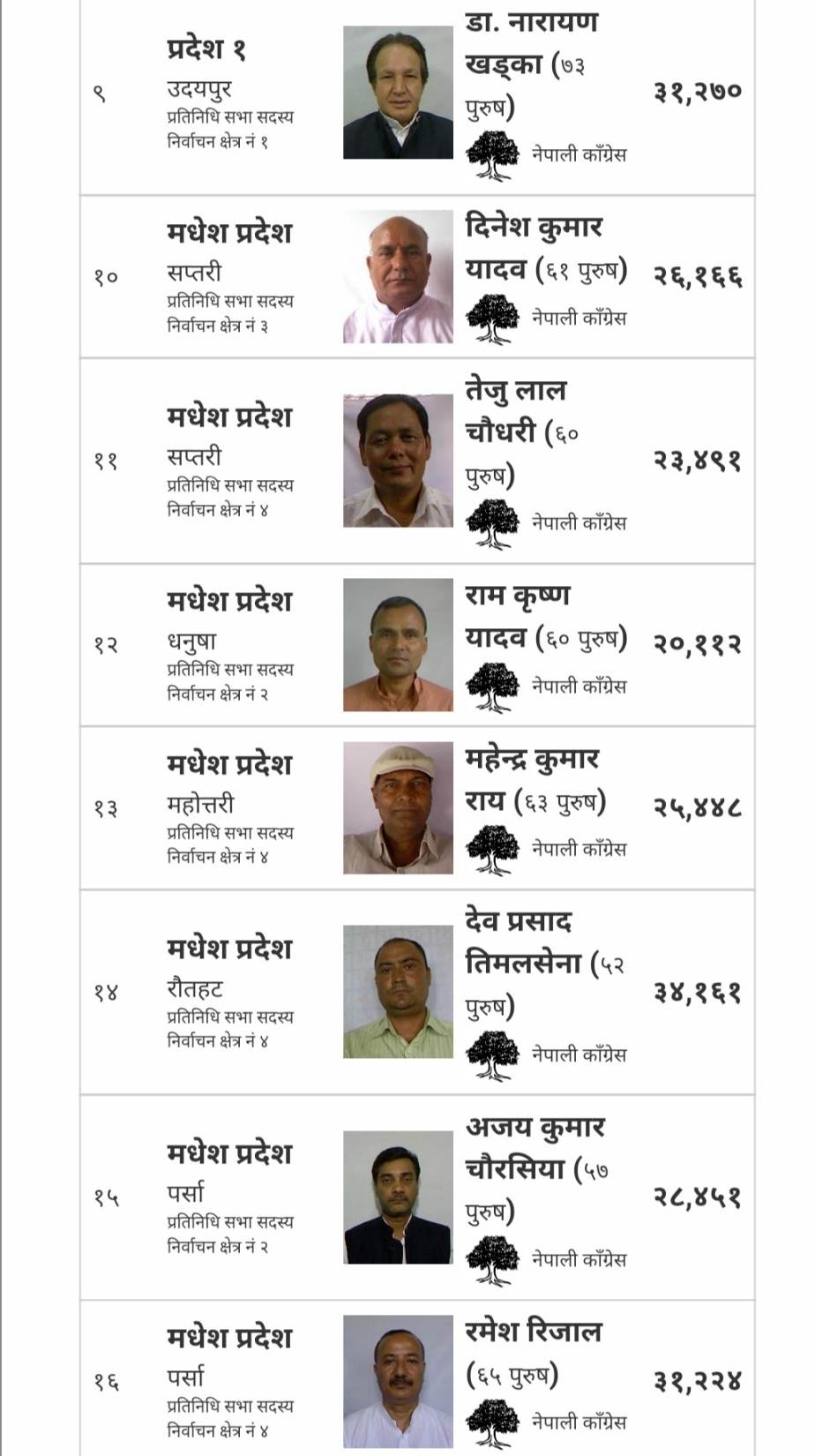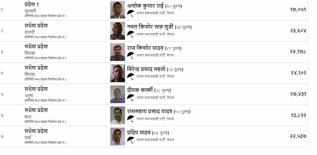 त्यस्तै लोकतान्त्रिक समाजवादीले ४, नागरिक उन्मुक्ति पार्टीले ३, राष्ट्रिय जनमोर्चाले १, नेपाल किसान मजदुर पार्टीले १ र जनमत पार्टीले १–१ स्थानमा जित हासिल गरेका छन् ।