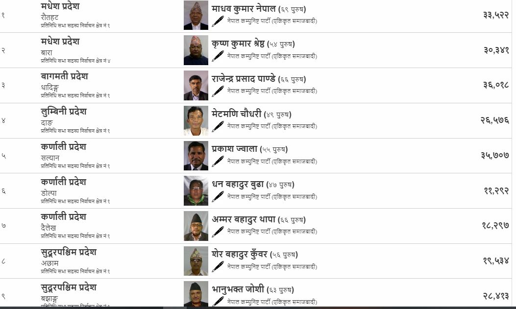 आयोगका अनुसार नेपाल कम्युनिष्ट पार्टी एकीकृत समाजवादीले १०, जनता समाजवादी र राष्ट्रिय स्वतन्त्र पार्टीले ७–७ स्थानमा जित हासिल गरेका छन् ।