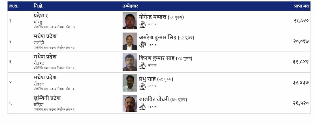 त्यस्तै देशभरबाट स्वतन्त्रले ५ निर्वाचन क्षेत्रमा जित हात पारेको आयोगले जनाएको छ ।