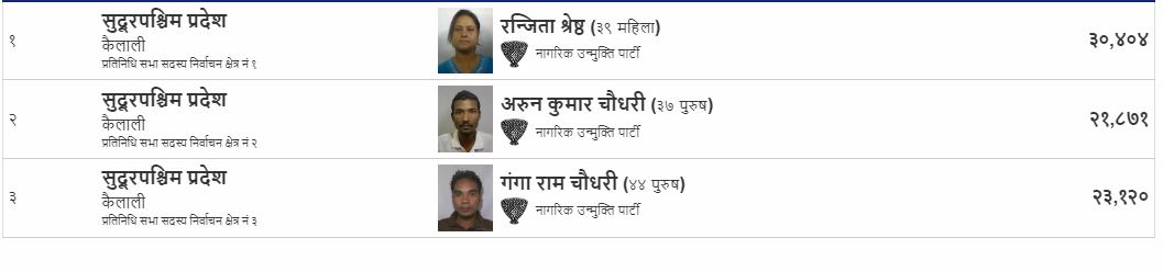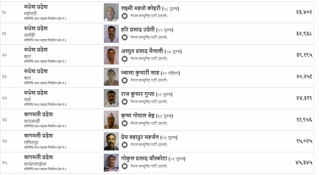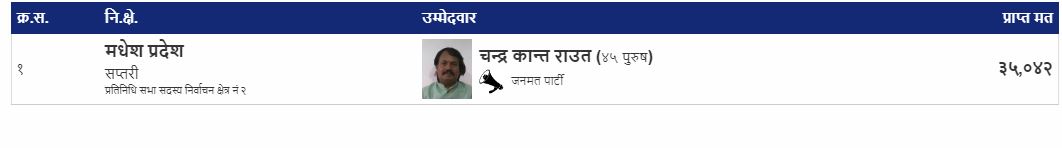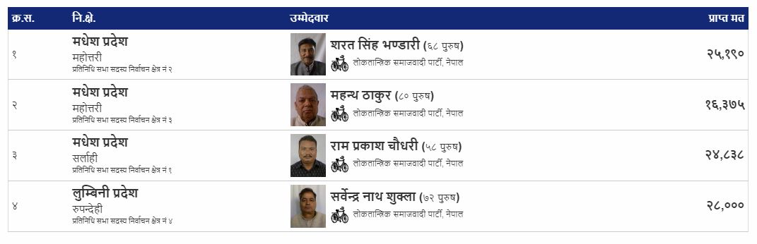 त्यस्तै लोकतान्त्रिक समाजवादीले ४, नागरिक उन्मुक्ति पार्टीले ३, राष्ट्रिय जनमोर्चाले १, नेपाल किसान मजदुर पार्टीले १ र जनमत पार्टीले १–१ स्थानमा जित हासिल गरेका छन् ।