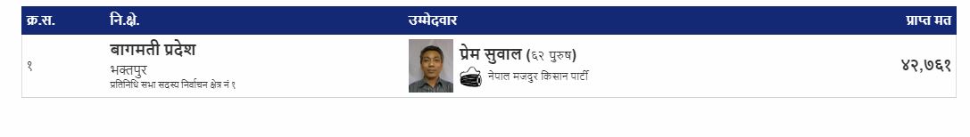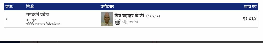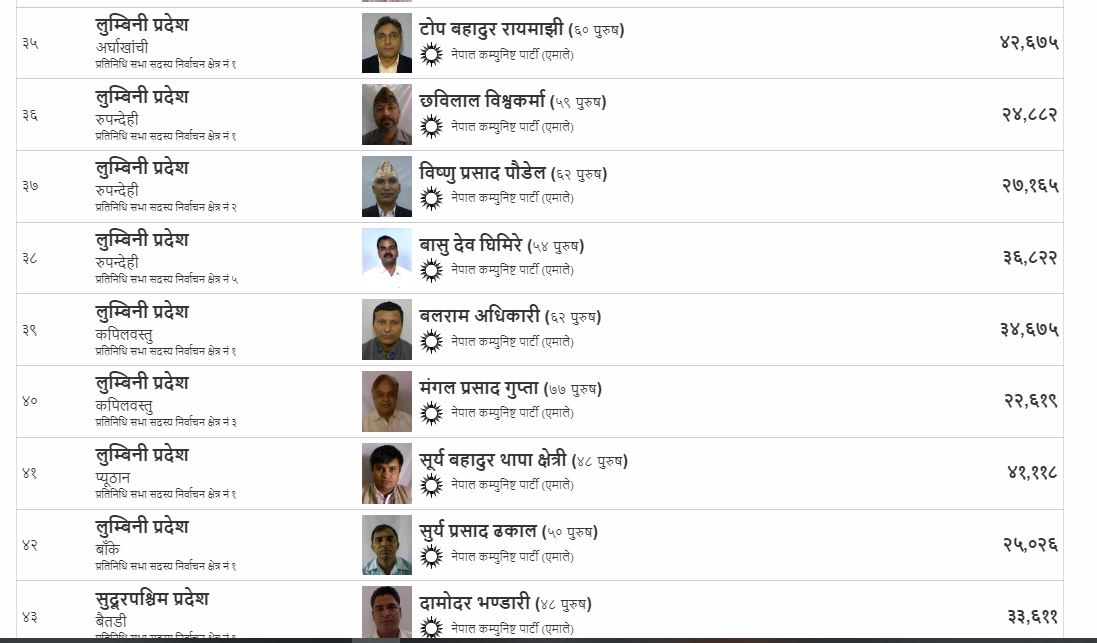 काठमाडौं । आम निर्वाचनको प्रतिनिधि सभाको प्रत्यक्षतर्फको सबै निर्वाचन क्षेत्रको अन्तिम परिणाम आएको छ ।