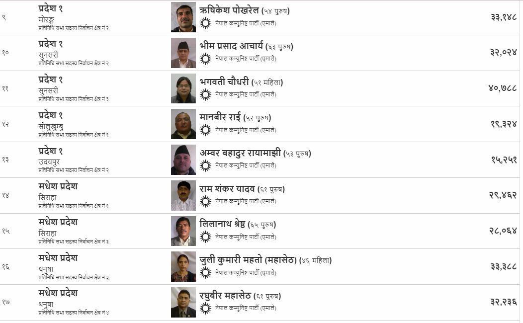 आयोगका अनुसार नेपाल कम्युनिष्ट पार्टी एकीकृत समाजवादीले १०, जनता समाजवादी र राष्ट्रिय स्वतन्त्र पार्टीले ७–७ स्थानमा जित हासिल गरेका छन् ।