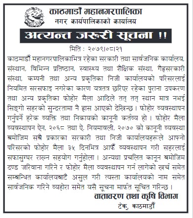 एक सूचना जारी गर्दै महानगरपालिकाले सरकारी तथा सार्वजनिक कार्यालय, संस्थान, प्रतिष्ठान, स्वास्थ्य तथा शैक्षिक संस्था र गैरसरकारी संस्था वा अन्य प्रकृतिका निजी कार्यालय परिसरमा फोहोरमैला थुप्रिएकोले हटाउन निर्देशन दिएको हो।