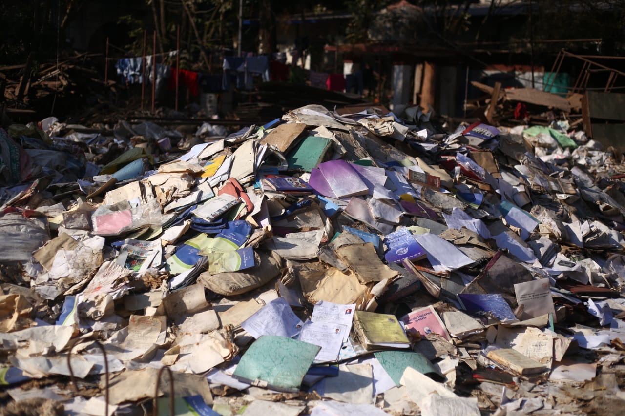 बोरामा पोको पारेर राख्दा पानीले भिजेर बिग्रिसकेका कागजात केशर पुस्तकालयले दिनभर घाममा सुकाउन थालेको हो ।