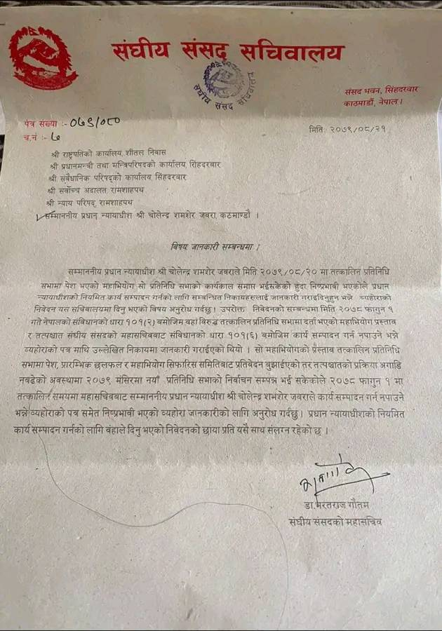 संघीय संसद सचिवालयका महासचिव डा. रोजनाथ पाण्डेले राष्ट्रपति कार्यालय, प्रधानमन्त्री कार्यालय लगायत सम्बन्धित निकायलाई जानकारी दिँदै पत्र पठाएका हुन् ।