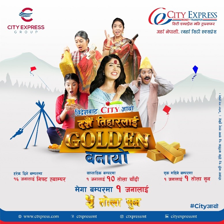 सिटी एक्सप्रेस मनी ट्रान्सफरले दसैँ, तिहार र छठ्लाई लक्षित गर्दै आफ्ना ग्राहकवर्गहरुसँग पर्वको खुशी साट्न लगातार ६३ दिन सम्म चल्ने “विदेशबाट सिटी आयो, दसैँ तिहारलाई गोल्डेन बनायो” उपहार योजना घोषणा गरेको थियो ।