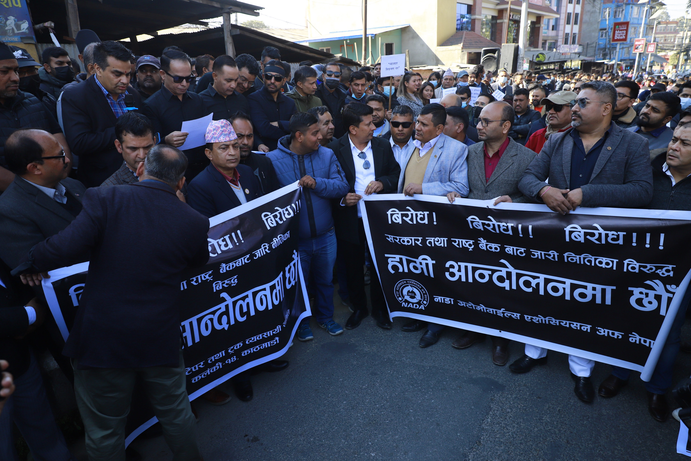 अटोमोबाइलका शोरुम तथा केही गाडीको अगाडि र पछाडि आयात प्रतिबन्ध खोल, गरी खान देऊ, शतप्रतिशत नगद मार्जिनको व्यवस्था खारेज गर, देशमा सरकार छ त, मौद्रिक नीति परिमार्जन गर लगायतका नारा लेखिएका ब्यानर टाँसेर व्यवसायीहरुले विरोध गर्दै आएका छन्।