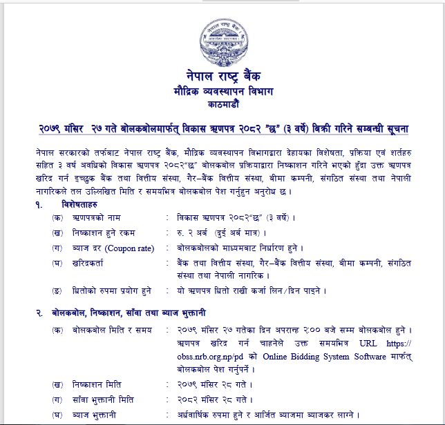 राष्ट्र बैंकद्वारा दुई अर्ब रुपैयाँको विकास ऋणपत्र बिक्री आव्हान