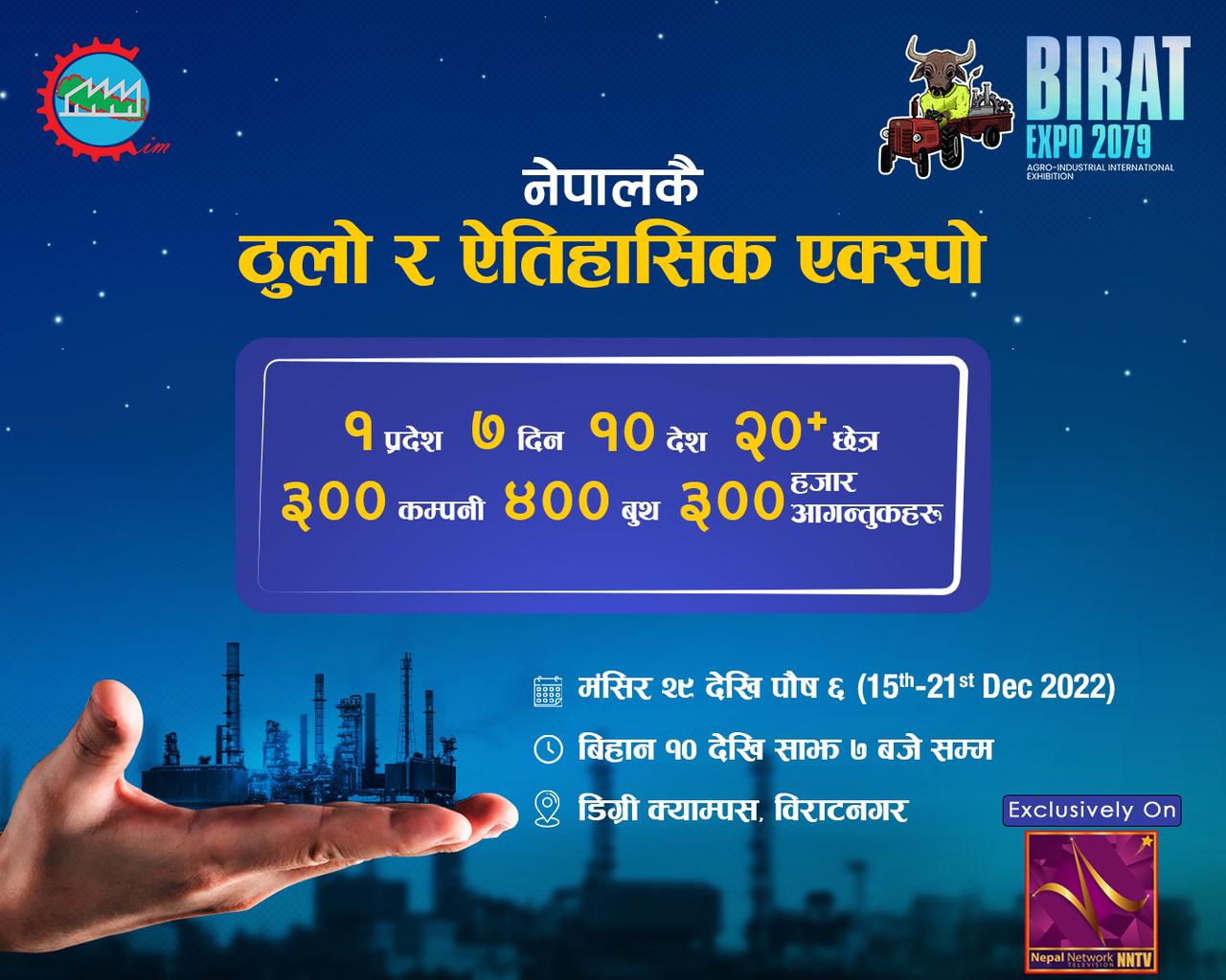 उद्योग संगठन मोरङको आयोजनामा विराटनगर महानगरपालिका–१४ स्थित डिग्री क्याम्पस (पुरानो हवाई फिल्ड)मा एक्स्पो हुन लागेको हो । आर्थिक एवम् औद्योगिक विकासको माध्यमबाट राष्ट्रिय अर्थतन्त्रमा टेवा पु¥याउने उद्देश्यका साथ ‘विराट एक्स्पो २०७९ कृषि तथा औद्योगिक अन्तर्राष्ट्रिय प्रदर्शनी’ को आयोजना गरिएको बताइएको छ । कृषि, पर्यटन, उद्योग र वाणिज्यः आर्थिक विकासको मुख्य आधार भन्ने मूल नाराका साथ एक्स्पो हुन लागेको हो ।