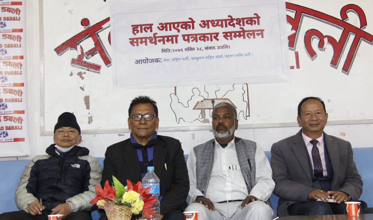बुधवार संवाद डबली पत्रकार सम्मेलनको आयोजना गरेर नेपाः राष्ट्रिय पार्टी, खम्बुवान राष्ट्रिय मोर्च र बहुजन शक्ति पार्टीले सो चेतावनी दिएको हो । कार्यक्रममा बोल्दै बहुमत शक्ति पार्टीका अध्यक्ष तथा पूर्वमन्त्री बिसेन्द्र पासवानले राजनीतिक आन्दोलनको क्रममा विभिन्न व्यक्तिमाथि लगाइएका झुटा मुद्दा खारेज गरिनुपर्ने बताए । उनले सरकारले ल्याएको अध्यादेश सकारात्मक भएको भन्दै राष्ट्रपति भण्डारीले जारी गर्नेपर्ने धारणा राखे ।