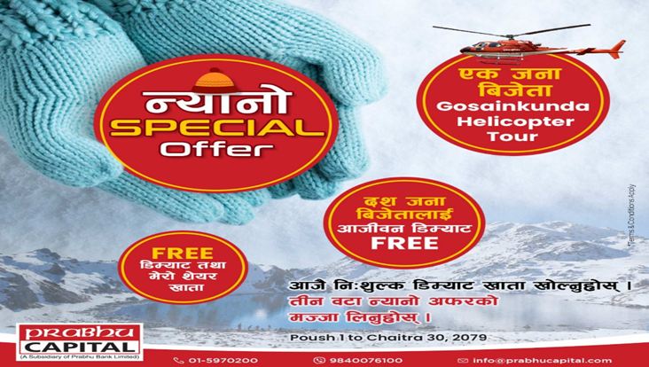 काठमाडौं । प्रभु क्यापिटल लिमिटेडले “न्यानो स्पेशल अफर” सञ्चालनमा ल्याएको छ । कम्पनीले यस वर्षको जाडो मौसममा घरमै बसीबसी अनलाईनबाट प्रभु क्यापिटलको कार्यालय कमलादी वा प्रभु बैंकको शाखामा गई डिम्याट खाता खोल्न चाहने ग्राहकहरुको लागि हिली राईडको सफर वीथ प्रभु क्यापिटलको न्यानो अफर भन्ने स्लोगन सहित निःशुल्क डिम्याट स्किम ल्याएको हो ।