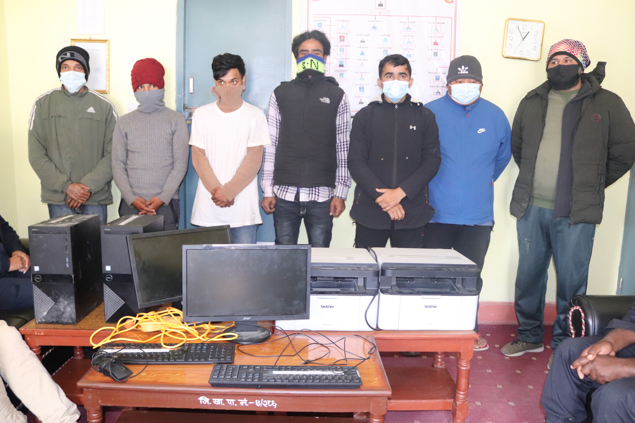 उनीहरुले श्री आरुखर्क आधारभूत विद्यालयबाट २०७८ फागुन २२ गते कम्प्यूटर सेट थान १, प्रिन्टर थान १, मल्टिप्लग थान १ चोरी गरेका थिए भने २०७८ फाल्गुन २४ गते श्री राम्चेदेवी आधारभूत विद्यालयबाट प्रोजेक्टर थान १, डेल कम्पनीको कम्प्यूर सेट थान १, एचपी कम्पनीको प्रिन्टर मेशिन थान १, ब्रदर कम्पनीको फोटोकपी मेशिन थान १, मल्टिप्लक थान ३ चोरी भएको थियो ।