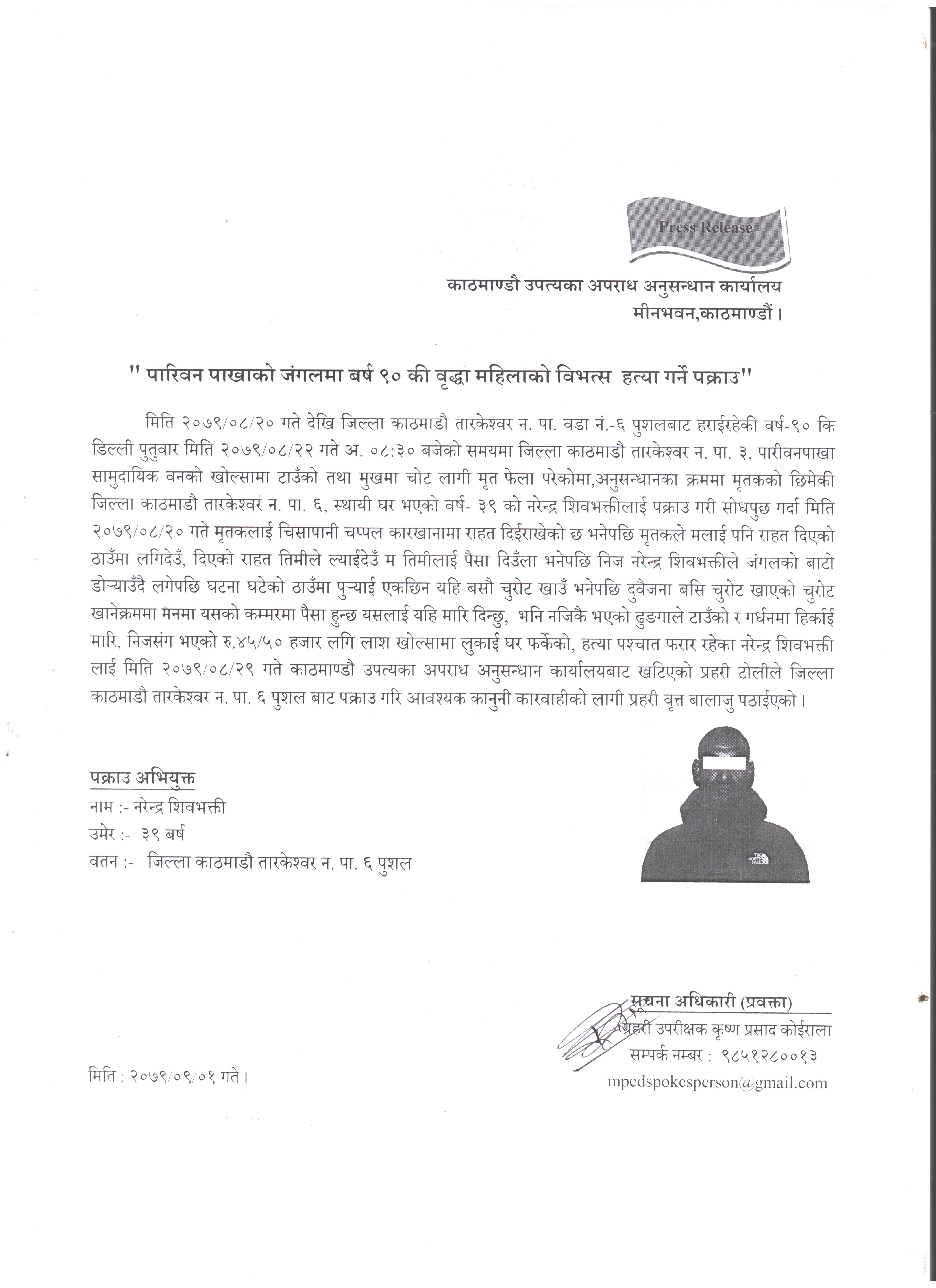 काठमाडौं । ९० वर्षीया महिलाको हत्या गरेको अभियोगमा एक पुरुष पक्राउ३९ वर्षीय नरेन्द्र शिवभक्तिलाई बिहीवार प्रहरीले पक्राउ गरेको छ ।