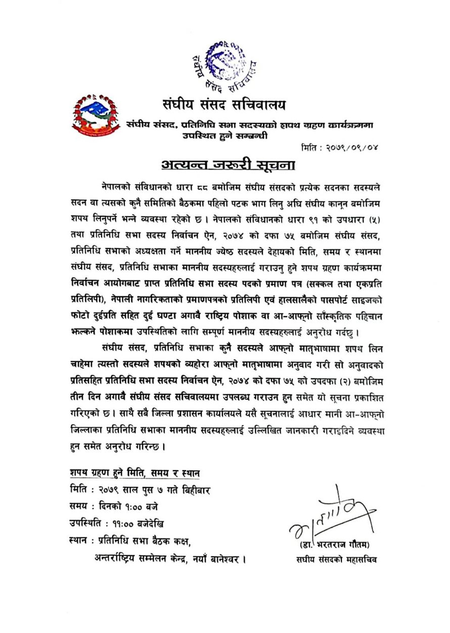 यस्ताे छ संघीय संसद सचिवालयकाे सूचना