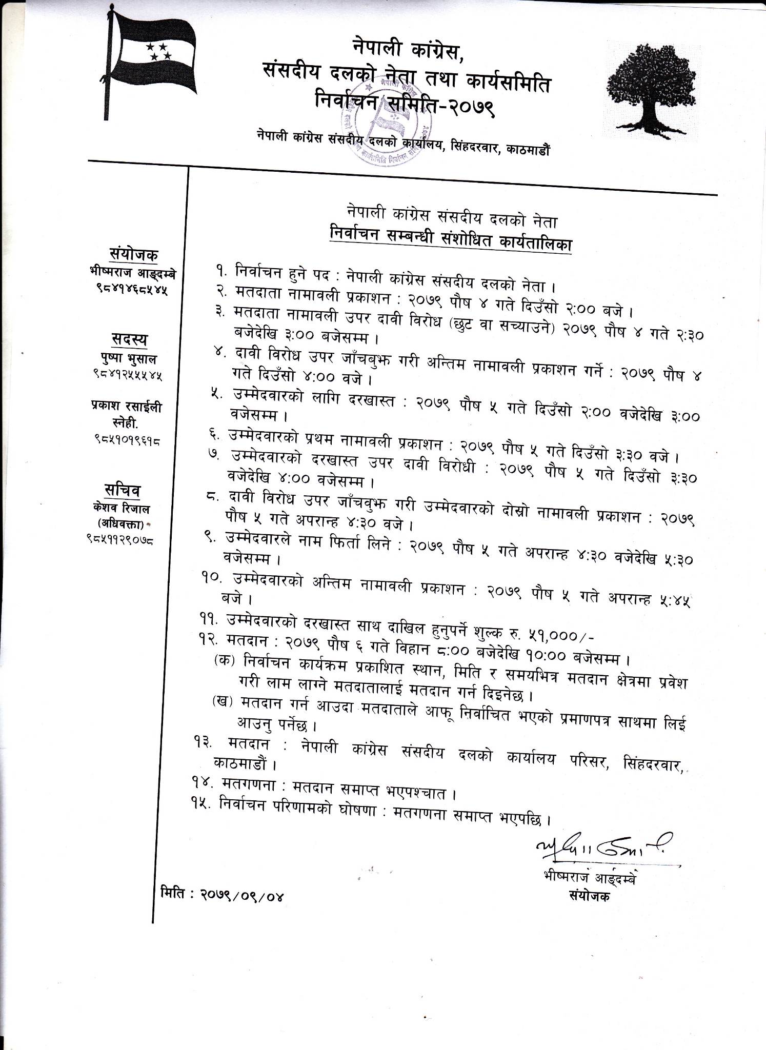 सार्वजनिक चुनावी कार्यक्रमअनुसार बुधबार बिहान ८ देखि १० बजेसम्म मतदान हुनेछ। नेपाली कांग्रेस संसदीय दलको कार्यालय परिसरमा मतदान हुदैँछ । कांग्रेस संसदीय दलको नेताका लागि शेरबहादुर देउवा, शेखर कोइराला, प्रकाशमान सिंह, गगन थापालगायतले आकांक्षा देखाएका छन् ।