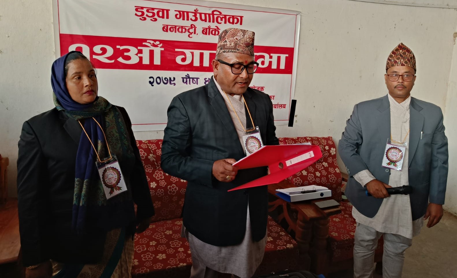 बाँके । डुडुवा गाउँपालिकाको नयाँ आर्थिक वर्ष २०७९–०८० को निति तथा कार्यक्रम र बजेट प्रस्तुत भएको छ । गाउँपालिकाको आज सोमवार बसेको १२ औँ गाउँसभाले एउटा विधेयक, निति तथा कार्यक्रम र ६५ करोड ३१ लाख ९३ हजार रुपैयाँको प्रस्तावित बजेट सार्वजनिक गरेको हो ।
