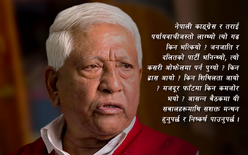 नेपाली काङ्ग्रेस र तराई पर्यायवाचीजस्तो लाग्दथ्यो, आज तराईमा हाम्रो गढ किन भत्कियो ? काङ्ग्रेसलाई जनजाति र दलितको पार्टी भनिन्थ्यो, त्यो कसरी ओझेलमा पर्न पुग्यो ? महिला समुदायको सबैभन्दा बढी समर्थन तथा सहयोग प्राप्त गर्ने पार्टी नेपाली काङ्ग्रेस नै हो, तर आज यसमा ह्रास आउनुको कारण के हो ? साविकमा पार्टीको नेतृत्व तरूण उमेर समुहको हातमा थियो, आज तरूणहरूलाई नेतृत्वको हैसियतबाट केले पछाडि पार्यो ? पार्टीमा नयाँ पुस्ताको सहभागितामा किन शिथिलता आइरहेको छ ? पार्टीको लक्षलाई सर्बप्रथम २००४ सालमा नेपालको माटोमा आन्दोलनद्वारा उतार्ने र २००७ को जनक्रान्तिलाई सफल बनाउन बलिदानी सहयोग दिने वर्ग मजदूर नै हो, तर आज मजदूर फाँटमा पार्टी किन कमजोर भइरहेको छ ? आसन्न महासमितिको बैठकमा यी सबालहरूमाथि सशक्त मन्थन हुनुपर्छ र निष्कर्ष पाउनुपर्छ ।