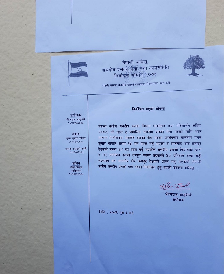 कांग्रेस संसदीय दलको निर्वाचनमा देउवा विजयी, गगनले पाए २५ मत
