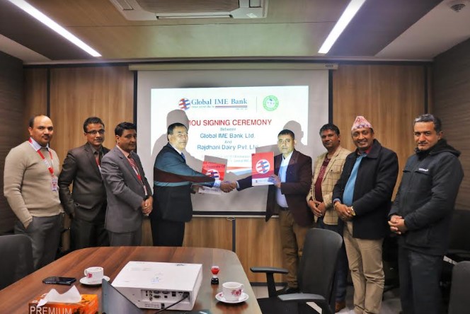 काठमाडौं । ग्लोबल आइएमई बैंक लिमिटेड र राजधानी डेरी प्रा.लि.बीच कृषि कर्जाको सहजीकरण सम्बन्धी समझदारी पत्रमा हस्ताक्षर सम्पन्न भएको छ । उक्त समझदारी पत्रमा ग्लोबल आइएमई बैंकका प्रमुख कार्यकारी अधिकृत रत्नराज बज्राचार्य र राजधानी डेरी प्रा.लि.का अध्यक्ष राजकुमार दाहालले हस्ताक्षर गरेका छन् ।