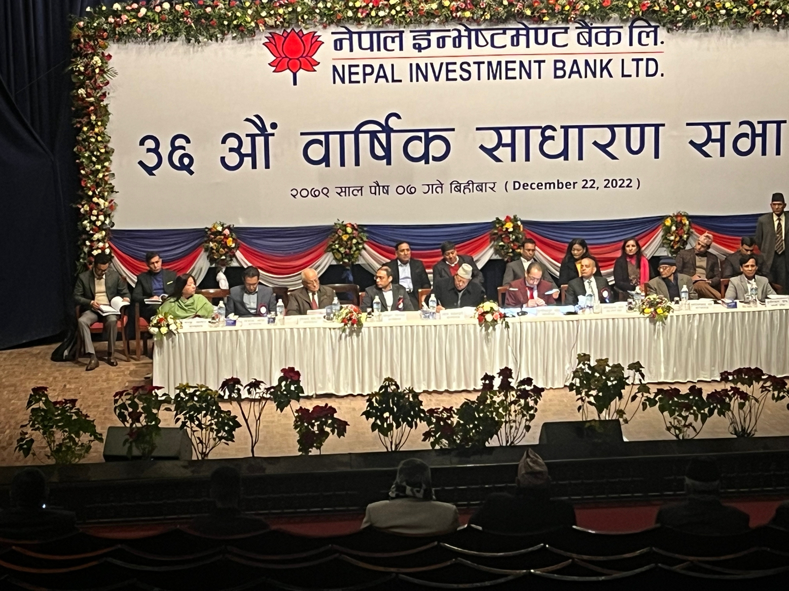 काठमाडौं । नेपाल इन्भेष्टमेन्ट बैंकको ३६ औँ बार्षिक साधारण सभा सम्पन्न भएको छ । बैंकले आज बिहिवार काठमाडौंको कमलादीस्थित नेपाल प्रज्ञा प्रतिष्ठानमा बार्षिक साधारण सभा सम्पन्न गरेको हो ।