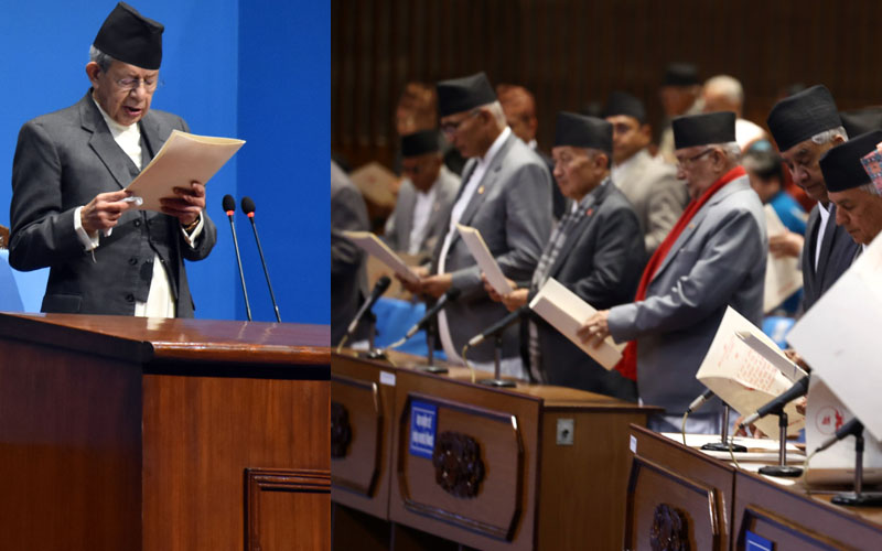 आगामी ५ वर्षका लागि जनताप्रति पूर्ण बफादार रही सत्य निष्ठापूर्वक काम गर्ने भन्दै सांसदहरुले कसम खाए । संसदका २७५ प्रतिनिधि सभा सदस्यमध्ये आज २७१ सांसदको मात्र उपस्थिती रहेको थियो । माओवादी केन्द्रका सांसद रामकुमार राई, एकीकृत समाजवादीका प्रेमबहादुर आले, नेपाली कांग्रेसकी माया राई र माओवादी केन्द्रका महिन्द्र राय यादव शपथ ग्रहणमा उपस्थित भएनन् ।