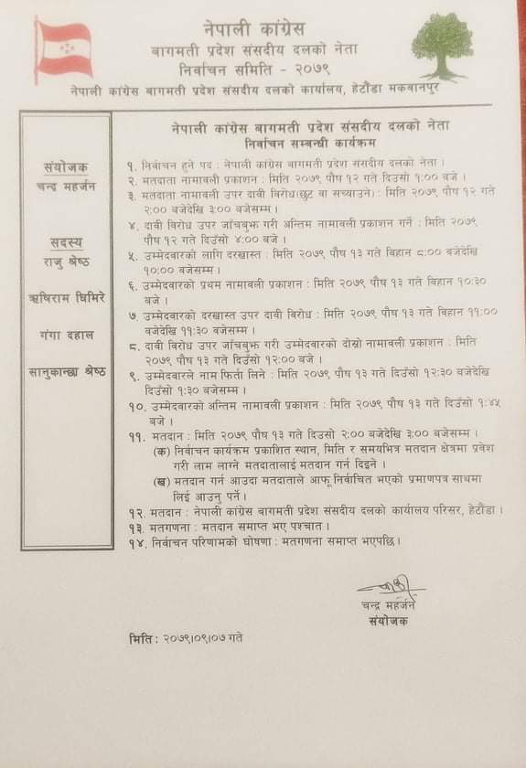 दावी विरोध उपर जाँचबुझ गरी अन्तिम नामावली प्रकाशन पुस १२ गते दिउँसो ४ बजे प्रकाश गरिने कांग्रेस बागमती प्रदेशले जनाएको छ । त्यसैगरी पुस १३ गते बिहान ८ बजेदेखि १० बजेसम्म उम्मेदवारको लागि दरखास्त (मनोनयन)को समय राखिएको छ ।